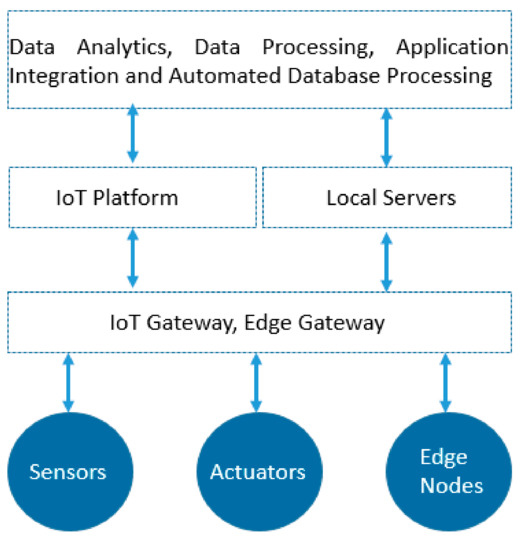 The IIoT infrastructure is designed in such a way that the actuators or sensors gather data from the surroundings and transmit it to the edge gateway in order to transit the raw data to the cloud, which further performs data-processing activities and derives meaningful information, as is illustrated in Figure 3.