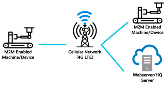 M2M communication refers to technology that supports the data transmission and interaction of devices. This communication eliminates the human intervention in IIoT applications. M2M communication connects things, such as sensors, actuators, and objects, in order to gather information and transmit accordingly [42]. M2M communication provides a dynamic resource-sharing mechanism that allows IoT entities to share resources with each other by using artificial intelligence (AI), deep learning (DL), etc. It also provides advanced architecture for the smart communication of IoT devices with each other [43]. The ultramodern architecture is elaborated in Figure 4.