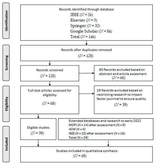 In the screening step, a total 68 studies were selected out of the 128 studies on the basis of the abstract and literature assessment. The articles that were less focused on the targeted topics were removed from the study. The selection of 68 studies was based purely on the relevant and concrete findings and contributions. We further verified our process in order to maintain cohesion in the selection of articles. The quality was considered at each stage, and, during the screening, a further 29 articles were eliminated because they were non-impactor publications. The databases and research were further extended to early 2022, and 29 more studies were included after the assessment, as is presented in Figure 8. A total of 68 studies were included in this literature after all of the steps: identification, screening, eligibility, and extension.