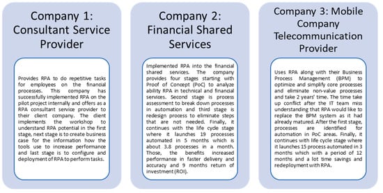 To further understand the RPA, information of real stories is presented to support the problem of the existing research studies. These case studies briefly overview different industries that have successfully implemented RPA to improve their business process. A presented in Sigurðardóttir [], the three examples are a consultant service provider, financial shared services, and mobile company telecommunication provider. The robots can improve speed and quality, can work non-stop, further decrease services inaccuracy so as to decrease the number of errors and increase availability and stability delivery [,] (see Figure 1).