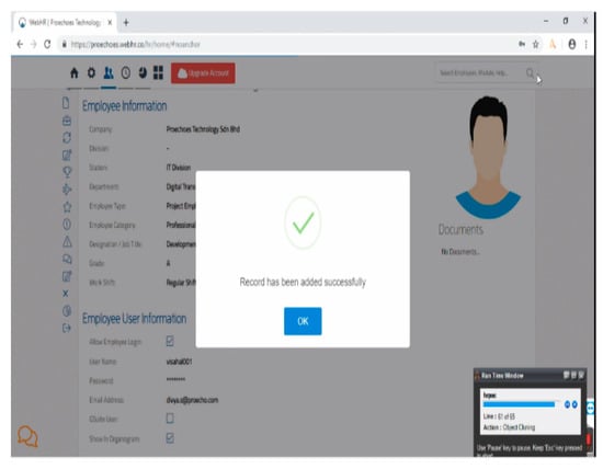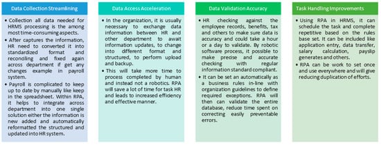 In HRMS, data accuracy to address human errors and mistakes is highly important because it involves business processing, and RPA has more potential error-free used unlike when performed by humans manually. With organizations beginning to implement the RPA in HRMS, there are some benefits in terms of changes, such as an effective and efficient system [,] (see Figure 4).