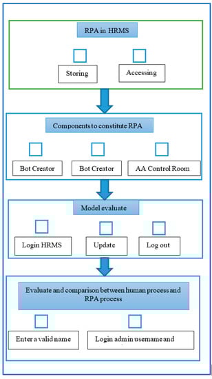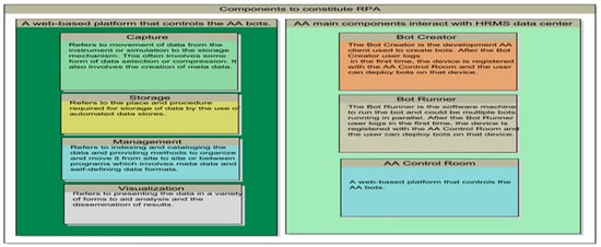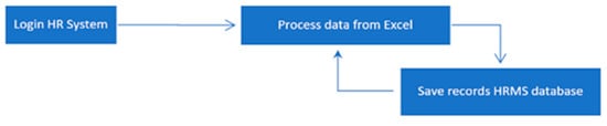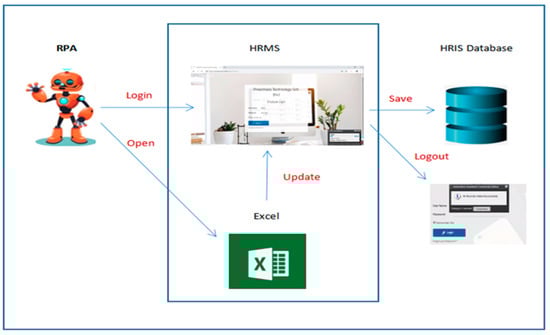 As shown in Figure 3, RPA consists of components that form the RPA platform to perform the task of automation, including repetitive and rule-based processes. HRMS is a combination of systems and processes that connect HRM, and information technology performs practical steps for the realization of departmental goals in modules []. These HRMS modules can assist in the following areas: