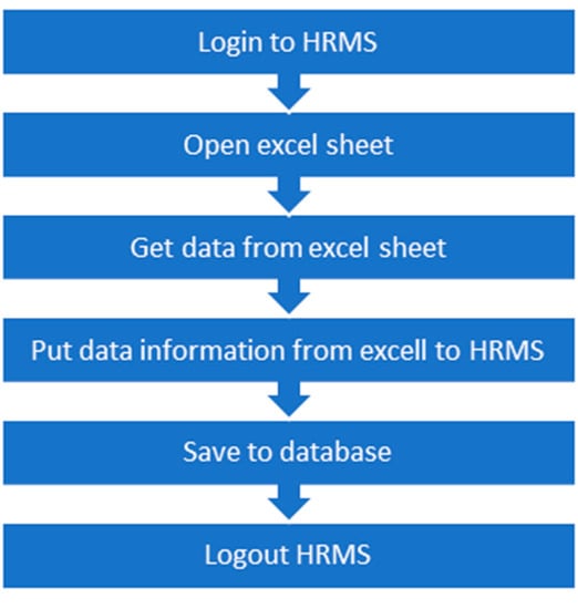 Currently, information is entered by HR manually for the purpose of updating information about their employees in the HRMS database. HR data entry often requires time-consuming and sometimes data may be entered incorrectly, causing serious problems to the organization. RPA can automate entire workflows of data entry from data gathering, logging, updating, processing, and validating data to maximize productivity by reducing the transaction time and maintaining an accurate data entry. According to the design, the process can be deconstructed and consists mainly of six steps (see Figure 6).