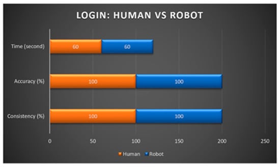 The second task for the login process between humans and robots revealed the same results in terms of the processing time, accuracy, and consistency in activity. Username and password were saved in the cache after being saved by ‘click remember me’. Therefore, the username and password do not need to be typed and are automatically displayed every time when logging in. Additional loading time will take 2 s depending on the networking used.