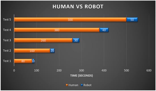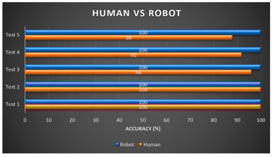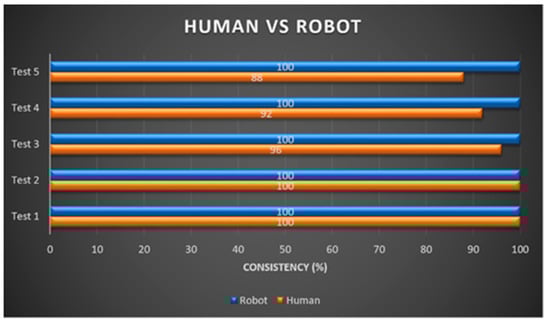 Figure 13 shows the result for the time, accuracy, and consistency measurements performed between humans and robots. Testing was performed three times, as shown in Table 2 and the result reveals no difference and no gap between human and robot for both tasks. The page of HRMS is saved and a shortcut is created at the desktop, while after clicking the browser it will automatically open the browser with HRMS. Additional loading time requires 2 s and depends on the networking, which is not controlled either by humans or robots.