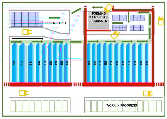 Figure 1 shows a diagram of the production hall of the analyzed company. The production process begins with the acceptance of the customer’s order. Customer service generates an order in the SAP system in accordance with the customer’s requirements. The order specifies such details as quantity, type of material, dimensions of the bags, type of packaging, and date on which the bags should reach the customer. Verification of orders in SAP is carried out by the planning department, the availability of material for the service is checked, and the production date is set. If material is out of stock, the planning department must order this material. The raw material suppliers are sister factories, so if the material is in the warehouse of one of the plants, the waiting period does not exceed 3 days. If material is not available, the waiting time depends on the workload of the extrusion department. The advantage of having sister factories is the possibility of transferring orders to another plant. It happens, for example, during a breakdown of one of the machines, when the timeliness of order fulfillment is threatened.