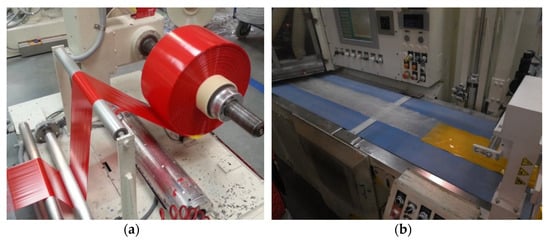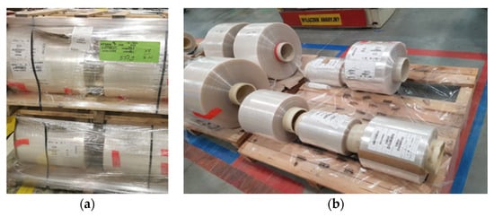 The raw materials used for production, presented in Figure 2a, are delivered by trucks. The material comes in the form of rolls from 50 to 250 kg, and its width is usually from 80 to 650 mm. The rolls are placed on pallets, usually 4 rolls on 2 levels. Due to the heavy weight of the load, it must be properly secured. The pallets for holding the rolls are made in such a way that the material cannot roll away (Figure 2b). This would be a threat to forklift operators and other production workers. When the load is unloaded, the material must be registered in the SAP system along with its exact location in the raw material warehouse. The SYM PLE program is also used for material management. The raw materials are transported exclusively with the use of forklifts.