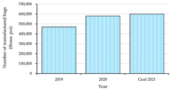 Due to the continuous increase in the demand for packaging on the Polish and German markets, the number of bags produced has been growing in the analyzed company for several years. Figure 4 shows the changes during years 2019–2021. In reality during the year 2021 the company realized production even higher than expected. In the early stages of the COVID-19 pandemic, the increase in demand for food packaging far exceeded the plant’s production capacity, and despite additional working hours, a large number of orders were delayed.