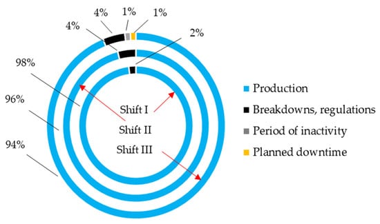 The data presented in Figure 6 show that the machine’s failure-free operation time in the 3rd shift is 4% shorter than in the 1st shift. In the 3rd shift, there was also machine downtime. The same number of failures occurred on shift 2 and shift 3, resulting in a significant reduction in production time.