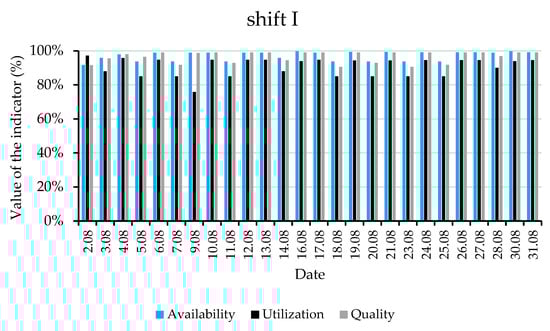 Calculated values of OEE components for shift I, II, and III are shown in Figure 7, Figure 8 and Figure 9. Analysis of the values of OEE components shows that the values lowering the value of the indicator are the utilization coefficients, being the same for shift I, II, and III. The value of the qualitative component remains high, reaching around 90%. Among all the results for the first, second, and third shift, the quality indicator is the best.