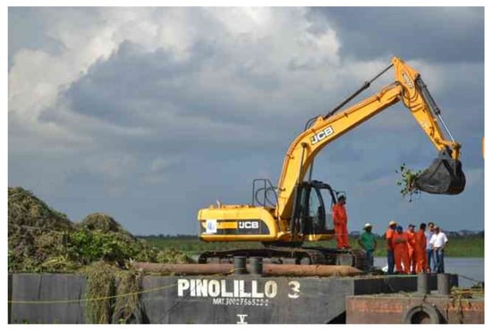 As a particular example, in the María Lizamba lagoon in the municipality of Tierra Blanca, the Government of the State of Veracruz, Mexico, through the Procuraduría Estatal del Medio Ambiente (State Environmental Prosecutor’s Office) (Figure 1), invested 1,979,953 USD. The goal was to extract 4000 tons of Pontederia crassipes in 483,000 m3 of water, obtaining a cost per ton of 495 USD, and also having in mind to propose the extracted plants as a usable product [15]. However, to date no results have been reported from the harvesting program mentioned above.