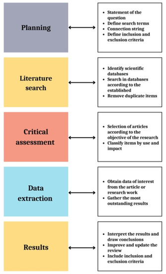 Therefore, information was sought in the scientific research databases Scopus, Science Direct, Scielo, Springer Link, Dialnet, and Google Scholar, published during a five-year interval (2016 to 2021) looking for the most recent studies. The SLR was organized as shown in Figure 2, which was developed in the following phases: (a) planning, (b) literature search, (c) critical assessment, (d) extraction of data, and (e) results.