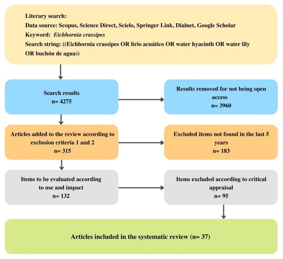 Two search terms were defined, first the scientific name of the plant “Eichhornia crassipes” as a keyword and second the search string, in order to maximize the literature exploration on the use and impact of P. crassipes (formerly Eichhornia sp.). For this purpose, the keyword was combined with the names or synonyms as known in some endemic regions and the Boolean operator “OR”. Thus, it is understood that an article only had to include some of the words to be retrieved in order to identify relevant papers and thus collect significant data of interest. Similarly, inclusion and exclusion criteria were established (Table 1) in order to review the information and extract the relevant data. Subsequently, a classification was made based on the uses and impacts of P. crassipes to obtain information related to product development and the generation of biodegradables products, in order to optimize the analysis and interpretation of the results of the literature review.
