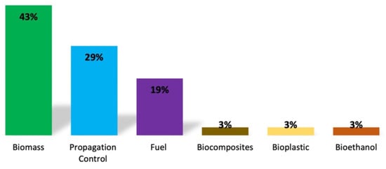 The literature review showed that the main topic of the research articles is approached from an environmental perspective, in relation to the propagation control, in which the authors propose the use of P. crassipes as biomass and the possibility of generating biodegradable products, such as fuel, biocomposites, bioplastics, and bioethanol (Figure 4).