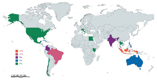 The results of the analyzed sample revealed the countries in which P. crassipes study proposals have been made (Figure 5). In Indonesia, 24% of the studies were conducted, making it the country that has the most research on P. crassipes and proposing an improved economic impact in the region if used appropriately. Then, 19% of the studies have been carried out in Brazil, while Colombia and India represent 8% each. Argentina, Australia, and the Philippines account for 5% each of the papers. The remaining countries such as Chile, Cuba, Egypt, United States, Italy, Kenya, Mexico, and Thailand represent 3%. On the other hand, at the University of the Armed Forces in Quito, Ecuador, studies were carried out on the proposal of four models of non-linear regression techniques corresponding to the biomass of P. crassipes, which would allow an experimental installation.