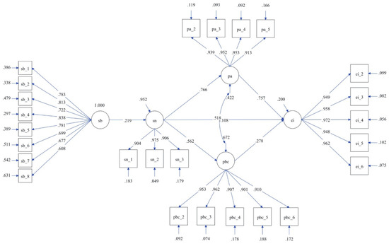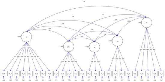 Similarly, the results of the indirect model [46] show that SN has an indirect, positive, and significant total effect (p < 0.000) on EI (INDSN→EI = 0.625). More specifically, it has an indirect, positive, and significant effect (p < 0.000) on PA (INDSN→PA→EI = 0.575) and has an indirect, positive, and significant effect (p < 0.000) on PBC (INDSN→PBC→EI = 0.158). This is consistent with the results of previous studies, in which it has been verified that the main influence of SN on EI is through its effect on PA and PBC. Table 5 shows the direct and indirect effects of the variables of the base model on EI.