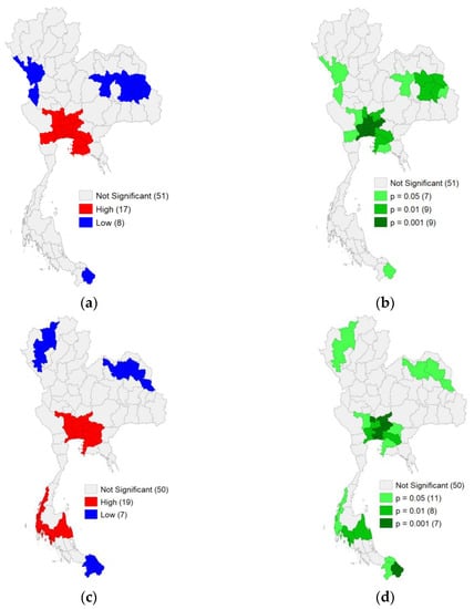 Similar to the analysis shown in Section 5.1.1, the spatial concentration of poverty headcount in Thailand was examined by using Getis-Ord General G method. Given that the poverty headcount statistics was surveyed and produced at subdistrict level, these data contribute a higher geographical resolution than the average household income derived from the provincial dataset of SES. Figure 7 illustrates the cluster maps and significance maps (i.e., p-value maps). With the finer spatial resolution, the cluster analysis yields more details of the geographical classification of low-income and high-income subdistricts.