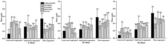 As soil layer depth increased, the mass of macro-aggregates decreased, while the mass of micro-aggregates increased significantly (p < 0.05). These variations were consistent for different restoration types. In the control plot, the large, small, and micro-aggregates showed significant variations (p < 0.05) in the 0–20 cm soil layer (Figure 2). Micro-aggregates formed the majority, followed by small and large aggregates. For GR and SH plots, the mass of small and micro-aggregates was significantly less than that of the large aggregates (p < 0.05). WL and TE aggregates did not differ significantly. In the second soil layer (20–40 cm) in both CL and SH, the mass of the macro-aggregates was apparently lower than that of the micro-aggregates (p < 0.05), and the aggregate mass did not differ significantly in WL and GR (p > 0.05). In the 40–60 cm soil layer, CL, GR, SH, and TE all exhibited a trend of large macro- < small macro- < micro-aggregates (p < 0.05), but no significant difference was found in WL plots (p > 0.05).