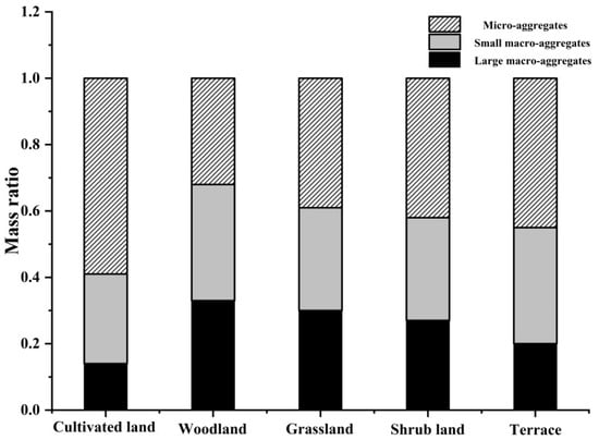 Soil aggregate stability (SAS) is vital for soil fertility, soil erosion resistance, soil aeration, and water infiltration and retention [1], while soil aggregate is the crucial indicator of soil structure [2]. Furthermore, soil aggregates protect organic matter from mineralization by reducing erosion [3]. The particle size distribution and SAS are affected by internal and external factors such as soil aggregate size, land use, and various physicochemical processes in different soil layers [4,5]. Based on the hierarchical theory of aggregate formation, these factors may lead to an uneven distribution of different size fractions of soil aggregates, which may lead to weakness in SAS [6].