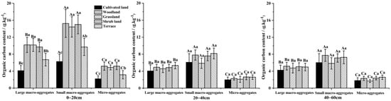SOC differed significantly between the micro- and large macro-aggregates in all land types except for WL (Figure 5). The SOC of CL and SH was mainly distributed in micro-aggregates and that of GR in large aggregates. The large macro-aggregates in TE had the lowest SOC content. The SOC storage increased significantly in soil macro-aggregates after the ecological restoration of CL to TE, SH, GR, and WL (p < 0.05), but it did not increase significantly from the control to the treatments in the micro-aggregates. This suggests that macro-aggregates (particle diameter > 0.25 mm) may occlude and protect more organic carbon during ecological restoration and that macro-aggregates are not destroyed by tillage.