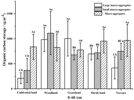SOC storage of soil aggregates of different sizes in different ecological restoration treatments. Note: An uppercase letter indicates a significant difference (p < 0.05) among different ecological restoration treatments at the same fraction size, and a lowercase letter indicates a significant difference (p < 0.05) among different fraction sizes in the same ecological restoration treatment.