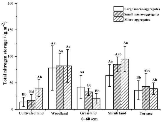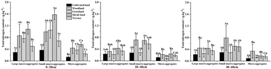 TN content of aggregates of different sizes with different ecological restorations. Note: A lowercase letter indicates a significant difference (p < 0.05) among different ecological restoration treatments at the same fraction size, and an uppercase letter indicates a significant difference (p < 0.05) among different fraction sizes within the same ecological restoration treatment.