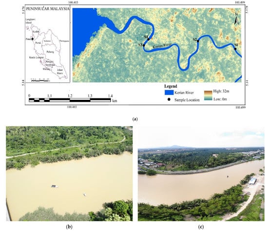 The study area was the downstream part of the Kerian River, situated in the state of Perak, the northern part of the Peninsular Malaysia. The area lies between latitudes 5°8′24″ and 5°10′41.94″ N and longitudes 101°24′12.89″ and 100°29′56.44″ E (Figure 1).