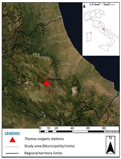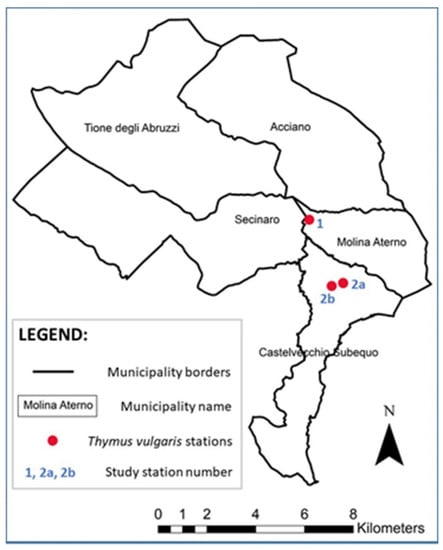 The study area is located in Central Adriatic Italy, in the “Appennino abruzzese” portion of the “Appennino Centrale” (Central Apennines; see Figure 1), in the L′Aquila province, Abruzzo administrative region. It belongs to the “Valle Subequana” valley, which is situated between the “Monte Sirente” mountain chain and the southern offshoots of the “Gran Sasso d′Italia” mountain chain (i.e., Mandra Murata and Piazza Clementina Mts.), along with the “Fiume Aterno-Pescara” river basin (Media valle dell′Aterno sector). We noticed two Th. vulgaris populations: Survey Station No.1 (Colle di More Mt., a small punctual area in Molina Aterno municipality) GPS Coordinates 42°9′35.68″ N–13°43′5.99″ E and; survey station No.2 (Colle Putano Mt., a large area in Castelvecchio Subequo municipality) GPS Coordinates (datum WGS84) e.g.,: (a) 42°8′11.89″ N–13°44′8.94″ E; (b) 42°8′5.25″ N–13°43′49.87″ E [1,2] (Figure 2).