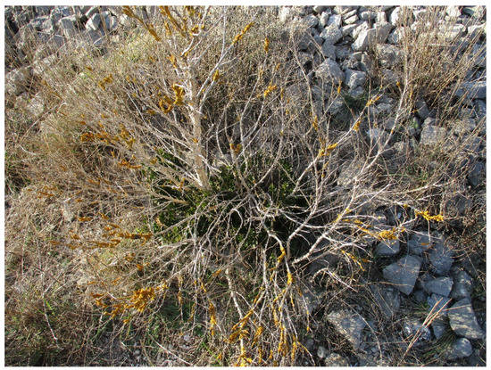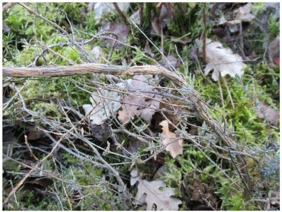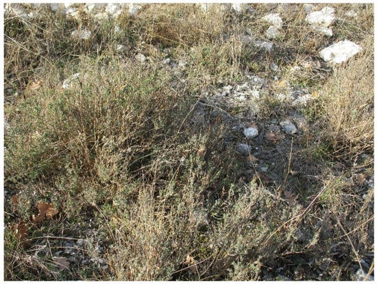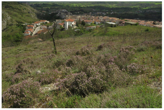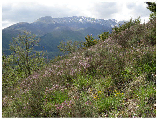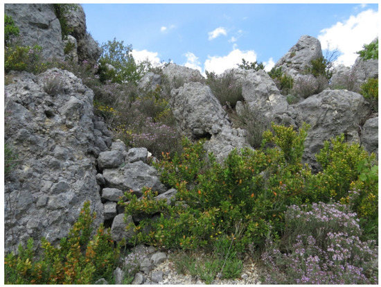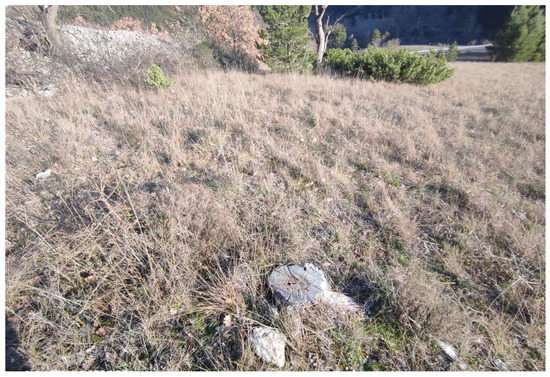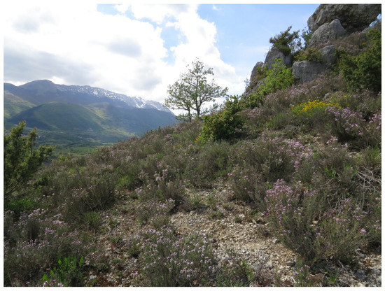 The Sigmeta shrub formations are characterised by Crataegus laevigata (Poir.) DC., Paliurus spina-christi Mill., Rosa canina L., Asparagus acutifolius L., Fraxinus ornus L. subsp. ornus, Juniperus deltoides R.P.Adams. The Sigmeta forest’s actual vegetation consists of Quercus pubescens Willd. subsp. pubescens dominated forest, completed mainly by sporadic Fraxinus ornus L. subsp. ornus. The first station (Colle di More) forest and shrublands formations are differentiated by the presence of Pyrus spinosa Forssk., Spartium junceum L., and Sorbus domestica L.; while in the second station (Colle Putano) the forest and shrublands formations are differentiated by the presence of Rhamnus saxatilis Jacq., Buxus sempervirens L., Pinus nigra J.F.Arnold subsp. nigra cfr var. italica Hochst [94], Pinus halepensis Mill. subsp. halepensis, Quercus ilex L. subsp. ilex and Prunus dulcis (Mill.) D.A. Webb. The Sigmeta forests of the second station are completed by patches of Pinus nigra J.F. Arnold subsp. nigra cfr var. italica Hochst or Pinus halepensis Mill. subsp. halepensis reforestation (Figure 7, Figure 8 and Figure 9).