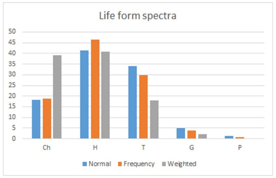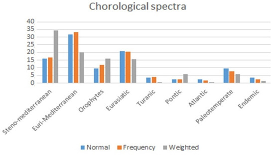 Life forms and chorological types of spectra were calculated for the plant community investigated in the study area. Both of them were calculated in three different ways: simple (presence/absence of every species); on the basis of the frequency of every species; weighted (coverage degrees of every species). For a clearer interpretation, the chorological types, taken from Flora d′Italia [33] have been grouped into broader categories: Stenomediterranean type (Stenomedit., W-Stenomedit., E-Stenomedit.); Eurimediterranean (Eurimedit., N-Eurimedit., W-Eurimedit.); Orophytes (Med.-Mont., N-Medit.-Mont., NE-Medit.-Mont., W-Medit.-Mont., Orophyte S-Europ.); Turanian (Eurimedit.-Turan., Stenomedit.-Turan.); Eurasian (Eurasiat., S-Europ.-Sudsib., Europ., Europ.-Caucas., W- and C-Europ., SE-Europ.); Pontic (Eurimedit.-Pontic, SE-Europ.-Pontic); Atlantic (W-Europ. (Atl.), Eurimedit.-Subatl.); Paleotemperate and Endemic. The phytosociological classification corresponds to the Prodrome of Italian vegetation [27].