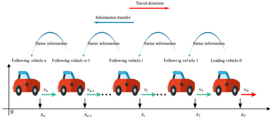 In this paper, a schematic diagram of the longitudinal movement of the platoon is shown in Figure 1. All vehicles in the platoon maintain stability through uniform constraint rules, which are comprehensively characterized by factors such as the spacing error and speed of the vehicles. Here, denotes the position of the ith vehicle. The index number of the vehicle is equal to 0, indicating that the vehicle is the leader of the platoon, namely, the first vehicle in the platoon. Furthermore, and stand for the position and velocity of the leading vehicle, respectively. Similarly, and stand for the position and velocity of the following vehicle n, respectively.