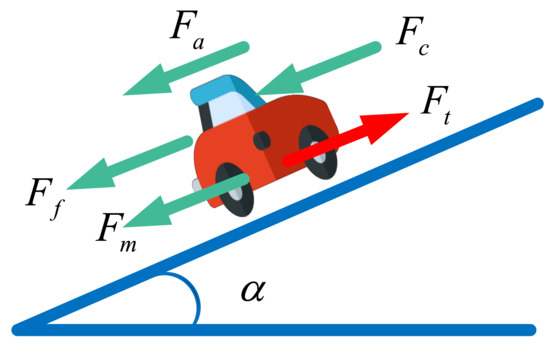 For any vehicle in a platoon, without loss of generality, assume that the vehicle travels on a horizontal road surface, the tractive force of the vehicle is mainly composed of rolling resistance , air resistance , mechanical resistance and acceleration resistance (ignoring the influence of wind speed) [40]. A diagram of longitudinal force on the vehicle is shown in Figure 2.
