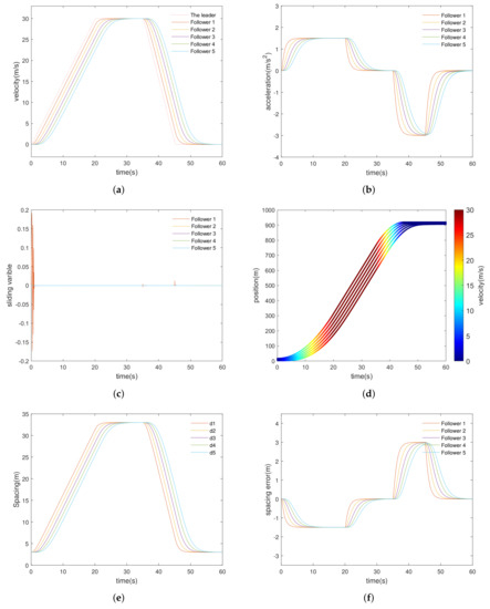 The cyclic acceleration and deceleration experiment requires the high continuous switching ability of the control system. From the Figure 6a, we can see that the velocity follows well and the adjustment process is very smooth. The transition time to stability is about 10 s. Figure 6b shows that there is no obvious abrupt change in the acceleration and braking stage, and the following car keeps a good tracking effect on the leading vehicle. Figure 6c,d visualizes the change of the sliding variable and the positions of the vehicles, respectively. The results reflect control law can maintain the intervehicle distance well. Figure 6e,f reveal spacing and the spacing error, respectively. Any vehicle in the platoon can follow at the desired speed guarantee the spacing error converges to 0, fastly.