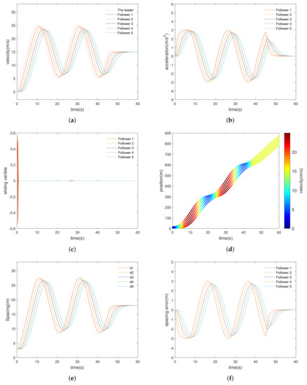 Figure 5a shows that each vehicle tracks the speed profile of the preceding vehicle very well, thus achieving good tracking of the lead vehicle. Namely, the following vehicle achieves the goal of keeping the speed of the following vehicle consistent with the speed of the leading vehicle, and the error is close to 0 when the vehicle speed reaches the steady-state. The adjustment time can be controlled within 10 s. Figure 5b describes the acceleration curve of each vehicle. Figure 5c shows the change of the sliding variable. Figure 5d is a schematic diagram of the position changes of each vehicle, which shows the good driving performance of the platoon, no collision occurred, and all vehicles are driving safely. Figure 5e reflects the distance between neighboring vehicles. This experiment uses the CTH strategy. It can be seen that as the speed of the vehicle increases, the distance between vehicles gradually increases. Figure 5f shows the spacing error of the vehicles in the platoon.