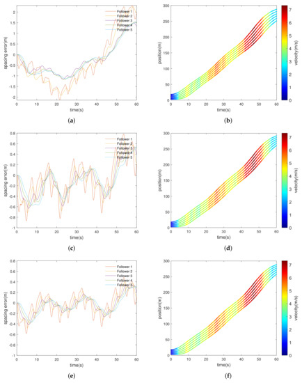Comparative experimental results. (a,b): string platoon with SMC and CTH . (c,d): string platoon with NFT-SMC and CTH . (e,f): string platoon with our method and CTH . (In (b,d,f), the curves from top to bottom represent the leading vehicle and the following vehicle from 1 to 5, respectively.)
