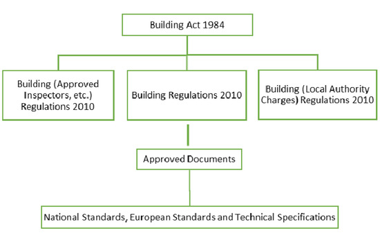 Most of these regulations were subsequently revised, amended and, further updated over the years and consultations are still ongoing [23]. For this, particular attention is needed to ensure that the most recent modifications are being considered. The Building Regulations, in general, do not contain technical details, which can be found in the related Approved Documents, providing “practical guidance” and an additional other non-statutory guidance. All of them link to “other non-statutory documents” such as National Standards, European Technical Approvals or Technical Specifications and European Standards (e.g., British Standards, Certificates, Agreement). This policy organisation, schematised in Figure 1, aims to simplify the system consultation and eventual modifications.