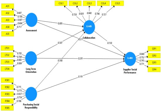 The model has sufficient predictive relevance when the Q2 values are more than 0 (Table 8). The effect size on both social performance and collaboration is considered as having moderate predictive relevance. Hair et al. [71] describe the Q2 effect sizes at Q2 values higher than 0, 0.25, and 0.50 show, respectively, small, medium, and significant predictive relevance of the PLS path model.