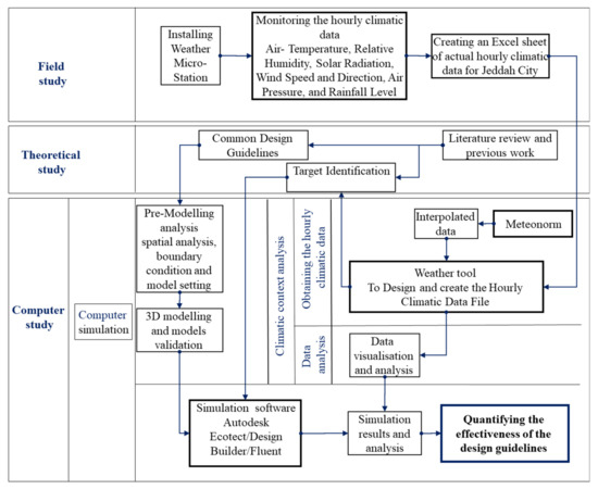 Weather Tool [38] software is used to visualize and analyze the hourly climatic data. The simulation stage includes four main tasks: (1) pre-modeling analysis, (2) 3D modeling and models’ validation, (3) quantifying the effectiveness of proposed scenarios, and (4) results handling and presentation. The pre-modeling analysis includes a spatial analysis, boundary condition and model setting. The 3D modeling and model validation present the appropriate techniques and methods to build the models in Autodesk Ecotect and Flovent and validate the models’ accuracy through physical modeling. Results are then analyzed using spreadsheets and SPSS software to present the effectiveness of the proposed designs under investigation.