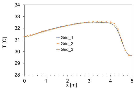 In a numerical solution, the number of cells in the discretized domain should not affect the accuracy. In order to perform this validation, the simulation is conducted three times with different grid sizes of quadrilateral cells systematically (grid-1, 53157; grid-2, 67480; grid-3, 85680). The grid refinement investigations for the temperature are shown in Figure 9. The maximum deviation produced is roughly 0.11 K (2.4%) for grid-2, which is chosen in this calculation. The difference between the ambient and the initial temperature is used to compute the error.