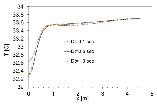 The present solution is unconditionally stable since the solver is fully implicit; nonetheless, the time-step size and number of iterations necessitate specialized techniques. Within 100 iterations, the time-step is set to 0.5 s, and convergence is obtained. Moreover, although the maximum number of iterations per time step is specified, the convergence requirements are met before the maximum number of iterations is reached. Additionally, we have to set a cap for the residual criterion. For the energy equation, it is chosen as , and for the rest of the equations, it is selected as . A suitable time-step is evaluated with temperature profiles as shown in Figure 10 along the x-axis in the center of the second floor and several time-step sizes (0.1, 0.5, and 1 s) after 20 s. Because the difference between the two time-step sizes, 1.0 and 0.5, is so tiny, we choose 0.5 s for the present simulation to save time.
