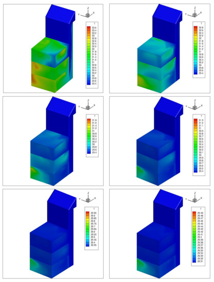 In the previous analysis, the values of the temperature and average air velocity inside at the middle point for each floor for the two cases under consideration showed that the cooling process of Case 1 is faster than in Case 2. Moreover, because the same volume of air enters and leaves the spaces, based on the Bernoulli effect, reducing the inner opening while leaving the exterior windows fully open speeds up the circulation. The findings indicated that Case 2 outperforms Case 1 in terms of GF and FF, but Case 1 outperforms Case 2 in terms of SF. Therefore, in the current study, more detailed phases are considered for analysis. The 3D temperature distribution of Cases 1 and 2 are investigated after 20, 40, 60, 80, 120, and 160 s (Figure 11 and Figure 12). As shown from the figures of Case#1, in around three minutes, the temperature is reduced by around three degrees. Additionally, one may notice that the third floor is cooled down faster than the other two floors. Similar results can be seen in Figure 12, which also presents the 3D temperature distribution of Case 2, after 20, 40, 60, 80, 120, and 160 s. In this case, the temperature is reduced by one degree only in three minutes. This indicates that Case 1 is doing much better than Case 2.
