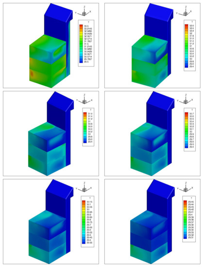 It is also apparent that—in general—the airflow has a significant effect in lowering the air temperature inside the three zones. When comparing velocity, magnitude and temperature, it is evident that Case#1 is also better than Case#2 in accelerating the air velocity and reducing the air temperature.