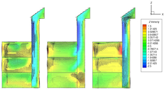 Z-velocity () vectors and contours at different cross-sectional planes y = 0.0, 2.43, and 4.86 cm, after 60 s.