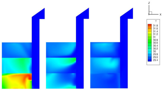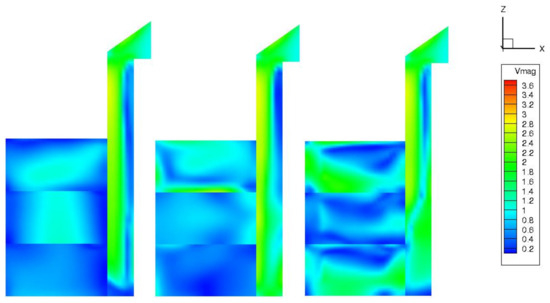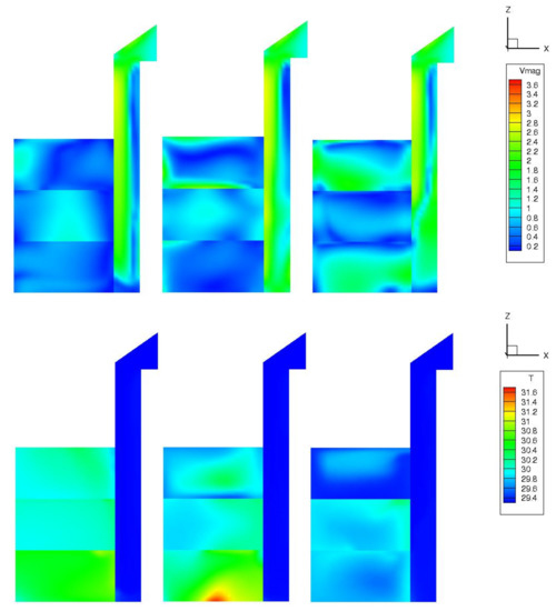 The air velocity magnitude and temperature distribution inside the model were simulated to understand the results better. The magnitude velocity and temperature distribution inside the model are depicted in Figure 14 and Figure 15, along the models’ right, center, and left sides in three vertical portions. The internal temperature and the air movement inside the three floors were simulated to understand the results further, as shown in Figure 14. This figure illustrates the air temperature inside the three zones for Case 1 after 60 s, at three vertical sectors y = 4.86 m (left side), 2.43 m (center), and 0.0 m (right side). Similarly, Figure 15 presents the temperature distribution and velocity field inside the model of Case 2 at different cross-sectional planes y = 0.0, 2.43, and 4.86 cm after 60 s. It is interesting that portions with high velocity have less temperature and vice versa.