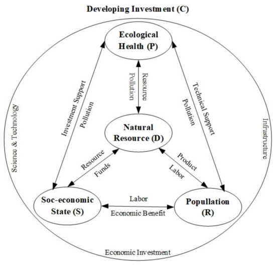 In our previous studies, we have proposed an indicator system of ICC based on DPSRC framework, and been improved based on the data availability and application validation [14,21,23]. After a summary analysis, we constructed the relationship between the first-class indicator and the DPSRC framework, especially in the dynamic changing process with socio-economic development (Figure 2). This framework is divided into five subsystems of natural resources (D), ecological environment (P), socio-economic development (S), population (R) and developing investment (C). The natural resource subsystem supply farmland, construction land, water, fishery, vegetation coverage to support socio-economic development and human life demand. Based on the labor workforce from the population subsystem, the natural resources are converted into socio-economic benefit. However, the over-utilization of natural resources generates some ecological environment pollution of industrial wastewater, SO2 and solid waste discharge, so that the ICC tends to decrease. Through the new technical support and the economic investment, the pollution problem is resolved, and the ICC is gradual recovered. In the whole system, the total amount of natural resource, the scale of economic development, the health of ecological environment and human activities are controlled by the government developing investment. The relatively balance between economic development scale and ICC status is dynamically regulated based on the infrastructure condition, science technology and financial investment.