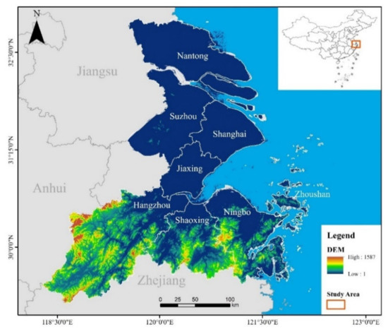 The Yangtze River Delta is located in eastern China (Figure 3), composed of four provinces. In 2018, the integrated development of the Yangtze River Delta had been upgraded to a national strategy and proposed at the first China International Import Expo. On the background of the most high-speed economic development, the difference of each city’s ICC was gradually widened, due to the exchange of natural resources. In this study, we took eight coastal cities as research objects, namely, Nantong, Suzhou, Shanghai, Jiaxing, Hangzhou, Shaoxing, Ningbo and Zhoushan. Most of the indicators’ data during 1996–2019 was obtained from the Statistical Yearbook of eight cities [29,30,31,32,33,34,35,36], Government Statistical Bulletin, Marine Bulletin [37] and historical data. Moreover, these data were also obtained from official government reports and statistics bureau (https://data.stats.gov.cn/; accessed on 25 February 2022). Meanwhile, the indicator’s value of vegetation coverage and land water were directly extracted from remote sensing imagery (http://www.gscloud.cn; accessed on 25 February 2022). Based on the correlation analysis and linear tendency, the data error and the extreme value correction were carried out.