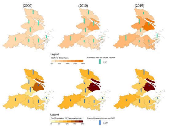 The Yangtze River Delta is an important area of socio-economic development in China. Based on the comparative analysis of total population, the gross domestic product (GDP), farmland area per capita and energy consumption per unit GPD during 1996–2019 (Figure 4), the conclusion are as follows. (1) The total population of eight cities grew rapidly. Due to the economic development center absorbing migration, the population of Shanghai has reached 24.28 million people. Due to the rapid utilization of land resources and the total population increasing, the farmland area per capita was decreasing. The top three cities were Suzhou, Shanghai and Hangzhou. (2) Driven by the national development planning and science technology support, the GPD of eight cities grew rapidly, with Nantong increasing from 72.06 billion Yuan to 897.2 billion Yuan and Zhoushan increasing from 12.2 billion Yuan to 125.0 billion Yuan. The average GDP ratio increased by 7–11 times, which was attributed to the National Planning of Regional Integrated Development in the Yangtze River Delta. (3) Because of the extensive development in the early stage, energy consumption per unit GPD increased quickly, thereby causing a frequent occurrence of the ecological and environmental problems. The average of energy consumption per unit GPD was 0.81 in 2000, and has decreased to 0.35. The health of the ecosystem was a prerequisite for socio-economic development.