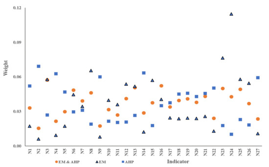 Scatter diagram of the indicator weight of the ICC index system. Note: Data were calculated by AHP, EM and improved method. They are from Table A2 in Appendix A.