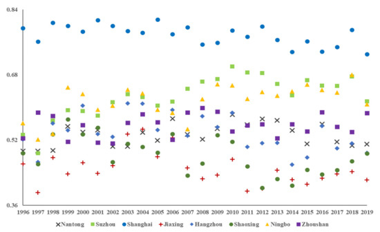 After the data normalization and weight calculation of third-class indicators, the ICC values of eight cities were calculated by using the state-space model [21]. Overall, the ICC of Shanghai is higher than other cities, with the highest value of 0.8154 in 2005. However, the ICC changing tendency of Shanghai was a fluctuating process during 1996–2019 (Figure 6), showing a downward tendency as a whole, which is due to the imbalance between natural ecological CC and socio-economic development.