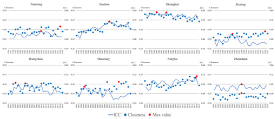 Based on the ICC changing tendency analysis of eight cities, Suzhou and Ningbo shows a relatively stable increasing tendency, and the largest value is 0.6758 and 0.6797 in 2018, respectively, in a same year. However, Nantong and Zhoushan presents a large volatility change. The ICC of Nantong increased 0.0603 from 2008 to 2010, but decreased 0.061 from 2012 to 2015. The ICC of Zhoushan increased to 0.0777 from 2006 to 2008, but decreased to 0.0716 from 1996 to 1998. The volatility change of ICC is caused by the imbalance between the demand of the socio-economic development and natural ecological CC, presenting the idea that humans are actively policy adjusting. The ICC of Jiaxing, Hangzhou and Shaoxing presented a very small change in volatility, which was decided by a comprehensive factor of the socio-economic development model, geographic location, species and quantity of natural resources, and so forth.